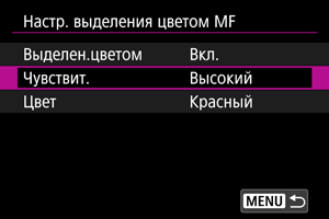- Выделение цветом MF может быть плохо видно при высокой чувствительности ISO, особенно если задано расширение диапазона ISO. Если требуется, уменьшите чувствительность ISO или задайте в пункте [Выделен.цветом] значение [Откл.].