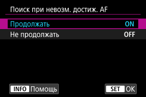 - Для супертелеобъективов и других объективов, охватывающих широкую область фокусировки, рекомендуется значение [Не продолжать], чтобы исключить существенные задержки из-за перемещений при поиске фокусировки при существенном отклонении объектива от требуемого положения фокусировки.