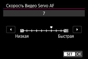 Можно задать скорость автофокусировки для режима «Видео Servo AF». Эта функция включается установкой для параметра [Видео Servo AF] в меню [: Видео Servo AF] значения [Вкл.], когда используется объектив, поддерживающий медленное изменение фокуса во время записи видео.*