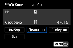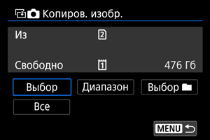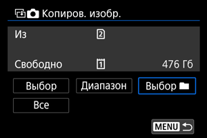 - Вариант [Выбор] не позволяет копировать изображения из нескольких папок одновременно. Выбирайте изображения для копирования из одной папки за раз.