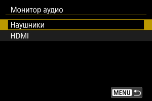 Можно выбрать комбинацию каналов для вывода на разъем наушников во время съемки или просмотра. Эта настройка также относится к выводу на наушники ().