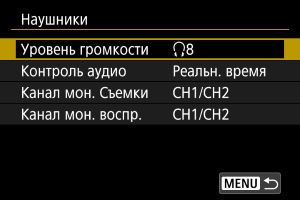 Вы можете выбрать звук во время записи видео, который будет использоваться для вывода на наушники. Для подавления шума при записи звука установите параметр [Подавл.акуст.шума] ().