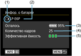 - Оставшаяся емкость отображается с шагом 1% и не отображается при установленном аккумуляторе LP-E6NH/LP-E6N или батарейном блоке BG-R10. Более того, эти аккумуляторы невозможно зарегистрировать.