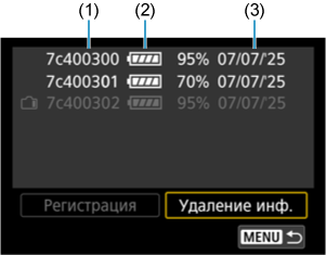 - В разделе Регистрация аккумуляторов в камере выберите пункт [Удаление инф.] на шаге 2.