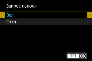 Можно выбрать, требуется ли ввод пароля при установке переключателя питания в положение или при возобновлении работы камеры после автоматического отключения питания.