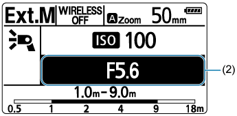 - Keď stlačíte tlačidlo spúšte fotoaparátu do polovice, zobrazí sa účinný dosah blesku (1).