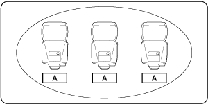 Napríklad, keď sú tri prijímače nastavené na skupinu spustenia , všetky budú ovládané ako jeden blesk Speedlite v skupine A.