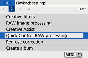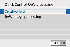 Môžete vybrať typ spracovania snímok RAW vykonávaného z obrazovky rýchleho ovládania.