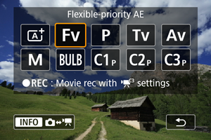 V tomto režime môžete nastaviť rýchlosť uzávierky, hodnotu clony a citlivosť ISO manuálne alebo automaticky a kombinovať tieto nastavenia s výberom kompenzácie expozície. Snímanie v režime [] s kontrolou nad každým z týchto parametrov, je ekvivalentné so snímaním v režimoch [