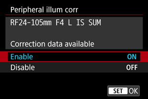 - Keď sa používajú objektívy od iného výrobcu ako Canon, odporúča sa nastaviť pre korekcie možnosť [Disable/Zakázať] aj v prípade, ak sa zobrazí hlásenie [Correction data available/Korekčné údaje dostupné].