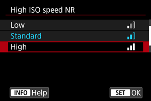 Môžete znížiť vznikajúci obrazový šum. Funkcia je účinná najmä pri snímaní s vysokými citlivosťami ISO. Keď snímate s nízkymi citlivosťami ISO, šum v tmavších častiach snímky (v tmavých oblastiach) sa môže zredukovať ešte viac.