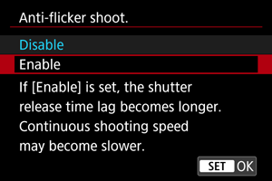 - Keď je nastavená možnosť [Enable/Povoliť] a fotografujete pri zdroji blikajúceho svetla, oneskorenie aktivácie uzávierky sa môže predĺžiť. Rýchlosť sériového snímania tiež môže byť nižšia a interval snímania nepravidelný.