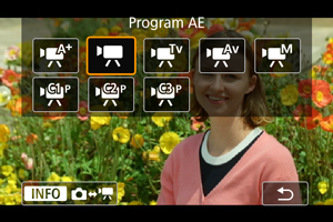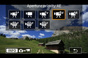 Režim nahrávania [] umožňuje nastaviť preferovanú hodnotu clony pre videozáznamy. Citlivosť ISO a rýchlosť uzávierky sa automaticky nastavia tak, aby vyhovovali danému jasu a dosiahla sa štandardná expozícia.