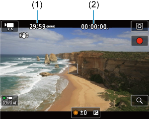 V pohotovostnom režime nahrávania zobrazuje dostupnú dobu nahrávania. Počas nahrávania zobrazuje čas, ktorý uplynul od začiatku nahrávania videozáznamu (1).