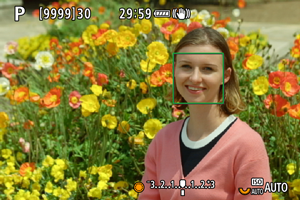 Fotoaparát rozpoznáva tváre osôb alebo zvierat a zaostrí na ne. Nad akoukoľvek rozpoznanou tvárou sa zobrazí bod AF [], ktorý sa potom bude sledovať.