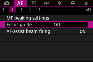 Pri nastavení položky [Focus guide/Sprievodca zaostrením] na možnosť [On/Zap.] sa zobrazí vodiaci rámik, ktorý zobrazuje, akým smerom treba upraviť zaostrenie a rozsah potrebných úprav. Vodiaci rámik sa zobrazí blízko očí, ktoré sa zistia pre hlavný objekt, keď je položka [: AF method/