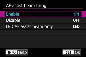 Umožňuje rozsvietenie pomocného lúča LED AF pomocou bleskov Speedlite vybavených touto funkciou, keď sú nasadené tieto zábleskové jednotky. Ak váš blesk Speedlite nie je vybavený svetlom LED, namiesto toho sa rozsvieti pomocný lúč AF fotoaparátu.