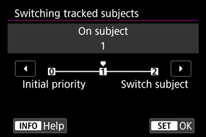 Toto nastavenie znižuje pravdepodobnosť, že fotoaparát bude sledovať iný objekt, ak sa objekt posunie mimo bod AF. Čím bližšie je nastavenie k znamienku mínus (–), tým menej pravdepodobné je, že fotoaparát bude sledovať iný objekt. Je to praktické, keď chcete zabrániť tomu, aby body AF začali rýchlo sledovať niečo, čo nie je plánovaným objektom počas panoramatického záberu alebo vtedy, keď sa pred body AF dostane prekážka.