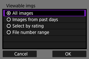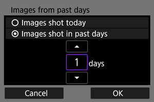 - Keď je vybratá možnosť [Images shot in past days/Snímky zhotovené v posledných dňoch], zobraziť možno snímky zhotovené maximálne pred určeným počtom dní od aktuálneho dátumu. Pomocou tlačidiel [