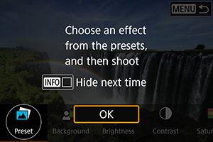 Ak chcete uložiť aktuálne nastavenie vo fotoaparáte, na obrazovke nastavenia [Creative Assist/Kreatívny asistent] ťuknite na položku [Register/Zaregistrovať] a stlačte tlačidlo [OK]. S názvom [USER*] môžete uložiť až tri predvoľby. Po uložení troch predvolieb sa musí existujúca predvoľba [USER*] prepísať, aby sa mohla uložiť nová.