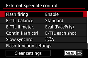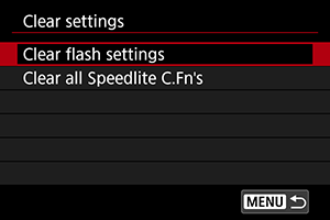 - Vyberte položku [Clear flash settings/Vymazať nastavenia blesku] alebo [Clear all Speedlite C.Fn's/Vymaz. všet. použív. funk. blesku Speedlite].