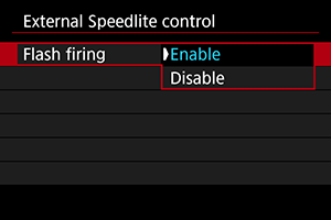 Ak chcete povoliť fotografovanie s bleskom, nastavte možnosť [Enable/Povoliť]. Ak chcete povoliť iba pomocný lúč AF blesku Speedlite, nastavte možnosť [Disable/Zakázať].