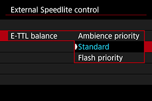 Môžete nastaviť preferovaný vzhľad (vyváženie) snímok s použitím blesku. Toto nastavenie vám umožní upraviť pomer okolitého osvetlenia k svetelnému výkonu blesku Speedlite.