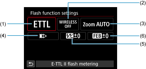 Informácie zobrazované na obrazovke, poloha zobrazenia a dostupné položky nastavenia sa môžu líšiť v závislosti od modelu blesku Speedlite, nastavenia užívateľských funkcií, režimu blesku a ďalších faktorov. Ďalšie informácie o funkciách blesku Speedlite nájdete v jeho návode na používanie.