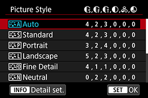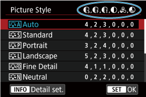 Na obrazovke na výber štýlu Picture Style sú ikony [Strength/Intenzita], [Fineness/Jemnosť] alebo [Threshold/Prah] pre položky [Sharpness/Ostrosť] aj [Contrast/Kontrast] a iné parametre. Čísla predstavujú hodnoty pre tieto nastavenia zadané pre príslušný štýl Picture Style.
