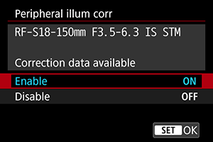 - Keď sa používajú objektívy od iného výrobcu ako od spoločnosti Canon, odporúča sa nastaviť pre korekcie možnosť [Disable/Zakázať] aj v prípade, ak sa zobrazí hlásenie [Correction data available/Korekčné údaje dostupné].