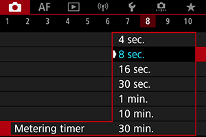 Môžete nastaviť, ako dlho pobeží časovač merania (ktorý určuje trvanie zobrazenia hodnoty expozície/uzamknutia AE lock) po spustení nejakou akciou, napríklad stlačením tlačidla spúšte do polovice.