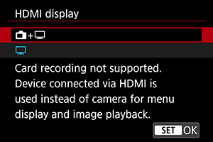 - Výstup HDMI bez informácií zabraňuje zobrazovaniu varovaní týkajúcich sa miesta na karte, kapacity batérie alebo vysokej vnútornej teploty () prostredníctvom HDMI.