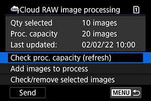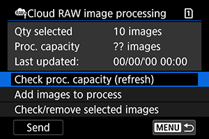 - Položka [Proc. capacity/Kapacita sprac.] je [0], pokiaľ nemáte zaplatené predplatné na cloudové spracovanie snímok RAW. Informácie o predplatnom dostanete na e-mailovú adresu uvedenú na stránke služby image.canon, ak skontrolujete kapacitu spracovania bez predplatného.
