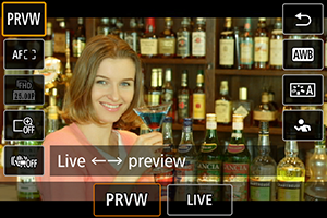 - Keď vyberiete možnosť [PRVW] (Preview/Náhľad), môžete otestovať streamovanie bez zverejnenia snímok. Užitočné na kontrolu snímok pred streamovaním.