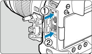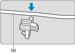 Ak používate len voliteľný prepojovací kábel Canon alebo hrubý/tenký komerčne dostupný kábel HDMI, pred pripojením držiaka (2) k ochrannému prvku kábla ho preveďte cez držiak.