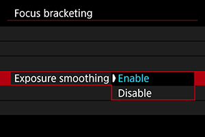 - Zmeny jasu snímky počas stupňovania zaostrenia môžete kompenzovať výberom možnosti [Enable/Povoliť], aby fotoaparát vykonal úpravy na základe rozdielov medzi zobrazenou a skutočnou hodnotou clony (efektívne clonové číslo), ktoré sa líšia podľa pozície zaostrenia.