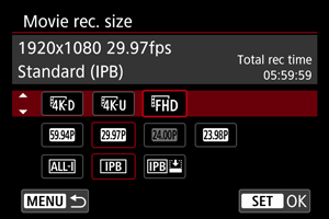 Môžete nastaviť veľkosť snímky, snímkovú frekvenciu a spôsob kompresie v položke [: Movie rec. size/