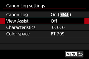 - Nastavenie tejto funkcie na možnosť [On/Zap.] neovplyvní videozáznamy nahraté na karte, ktoré sú zaznamenané pomocou charakteristík funkcie Canon Log. Podobne obrazový výstup HDMI má vlastnosti funkcie Canon Log a funkcia Asistent zobrazenia sa preň nepoužije.