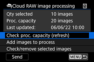 - Položka [Proc. capacity/Kapacita spracovania] je [0], pokiaľ nemáte zaplatené predplatné na cloudové spracovanie snímok RAW. Informácie o predplatnom dostanete na e-mailovú adresu uvedenú na stránke služby image.canon, ak skontrolujete kapacitu spracovania bez predplatného.