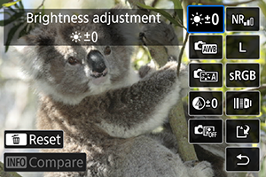 - Ak sa chcete vrátiť k nastaveniam snímok v čase nasnímania, keď sa zobrazí [Revert to shot settings/Návrat k nastaveniam snímky], stlačte tlačidlo