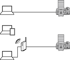 Režim prístupového bodu fotoaparátu je spôsob pripojenia na priame pripojenie fotoaparátu a ďalších zariadení cez Wi-Fi bez použitia prístupového bodu. K dispozícii sú tieto dva spôsoby pripojenia.