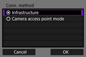 - Vyberte možnosť [OK] v ponuke [Conn. method/Spôsob prip.] a prejdite na nasledujúcu obrazovku.