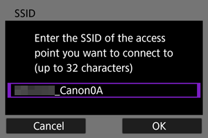 - Ak sa pripájate výberom položky [Easy connection/Jednoduché pripojenie], SSID končí reťazcom „_Canon0A“.