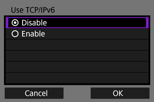 Vyberte spôsob nastavenia IP adresy a potom nastavte IP adresu na fotoaparáte. Ak sa používa IPv6, fotoaparát sa pripája iba cez IPv6. Pripojenia IPv4 sú vypnuté.