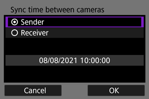 - Ak chcete nastaviť čas na viacerých prijímacích fotoaparátoch, postupujte podľa krokov č. 1–2 na každom prijímacom fotoaparáte.