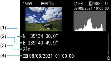 Informácie o geografickej polohe môžete skontrolovať zobrazením záberu, stlačením tlačidla prejdete na obrazovku prehrávania s podrobnými informáciami, a potom stlačte tlačidlo