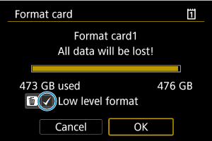 - Prebiehajúce formátovanie nízkej úrovne môžete zrušiť výberom možnosti [Cancel/Zrušiť]. Aj v tomto prípade sa dokončí bežné formátovanie a kartu môžete normálne používať.