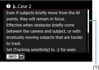Keď je zobrazená ikona [INFO Help/Pomocník], stlačením tlačidla INFO môžete zobraziť opis funkcie. Opätovným stlačením ukončíte zobrazenie Pomocníka. Ak sa chcete posúvať po obrazovke, keď sa vpravo zobrazí posúvač (1), otáčajte voličom Volič rýchleho ovládania 1.