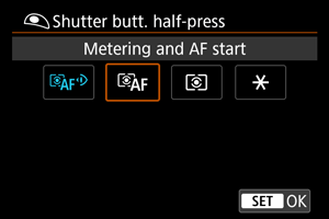 Pre každý režim merania môžete nastaviť, či sa má uzamknúť expozícia (uzamknutie AE) po zaostrení na objekty pomocou jednoobrázkového AF. Expozícia bude uzamknutá, kým držíte tlačidlo spúšte stlačené do polovice. Vyberte režimy merania pre uzamknutie AE a pridajte začiarknutie []. Nastavenie zaregistrujte výberom položky [OK].