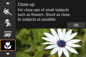 Režim [Záber zblízka] (Close-up/Záber zblízka) použite na zábery malých objektov zblízka, napríklad kvetov. Ak chcete, aby malé predmety vyzerali oveľa väčšie, použite makroobjektív (predáva sa samostatne).